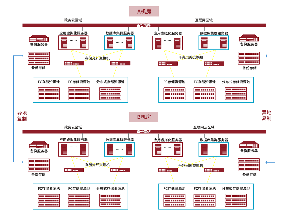 鼎甲在廈門電子政務(wù)云A、B機房的政務(wù)外網(wǎng)區(qū)和互聯(lián)網(wǎng)區(qū)分別部署了本地備份系統(tǒng),提供給互聯(lián)網(wǎng)區(qū)域、政務(wù)外網(wǎng)區(qū)域共300TiB的存儲容量,實現(xiàn)各自政務(wù)外網(wǎng)和互聯(lián)網(wǎng)區(qū)本地數(shù)據(jù)備份保護。且兩地各網(wǎng)絡(luò)區(qū)域之間備份系統(tǒng)通過專線互聯(lián),實現(xiàn)了備份數(shù)據(jù)異地復制和異地存儲。