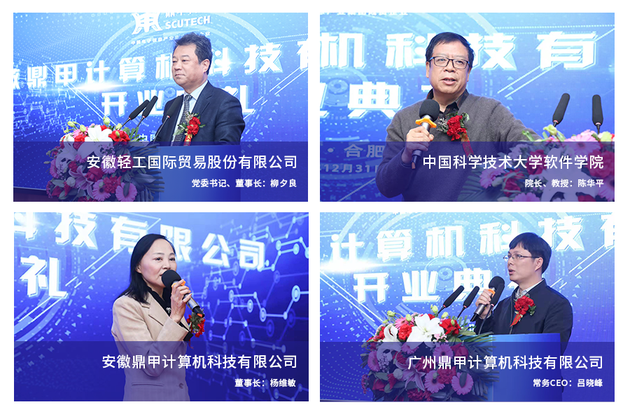 安徽輕工國際貿易股份有限公司黨委書記、董事長柳夕良先生,中國科學技術大學軟件學院院長、教授陳華平先生,安徽省原經信委副主任汪春生先生,安徽省原農業農村廳副廳長陳衛東先生,中國科學技術大學計算機科學與技術學院教授、原軟件學院執行院長周學海先生,中國科學技術大學計算機科學與技術學院教授、原軟件學院常務副院長李曦先生,合肥市高新區領導代表,安徽鼎甲董事長楊維敏女士,鼎甲科技常務CEO呂曉峰先生,鼎甲科技副總經理辛濤先生榮耀啟動開業儀式,共同見證這一重要時刻。