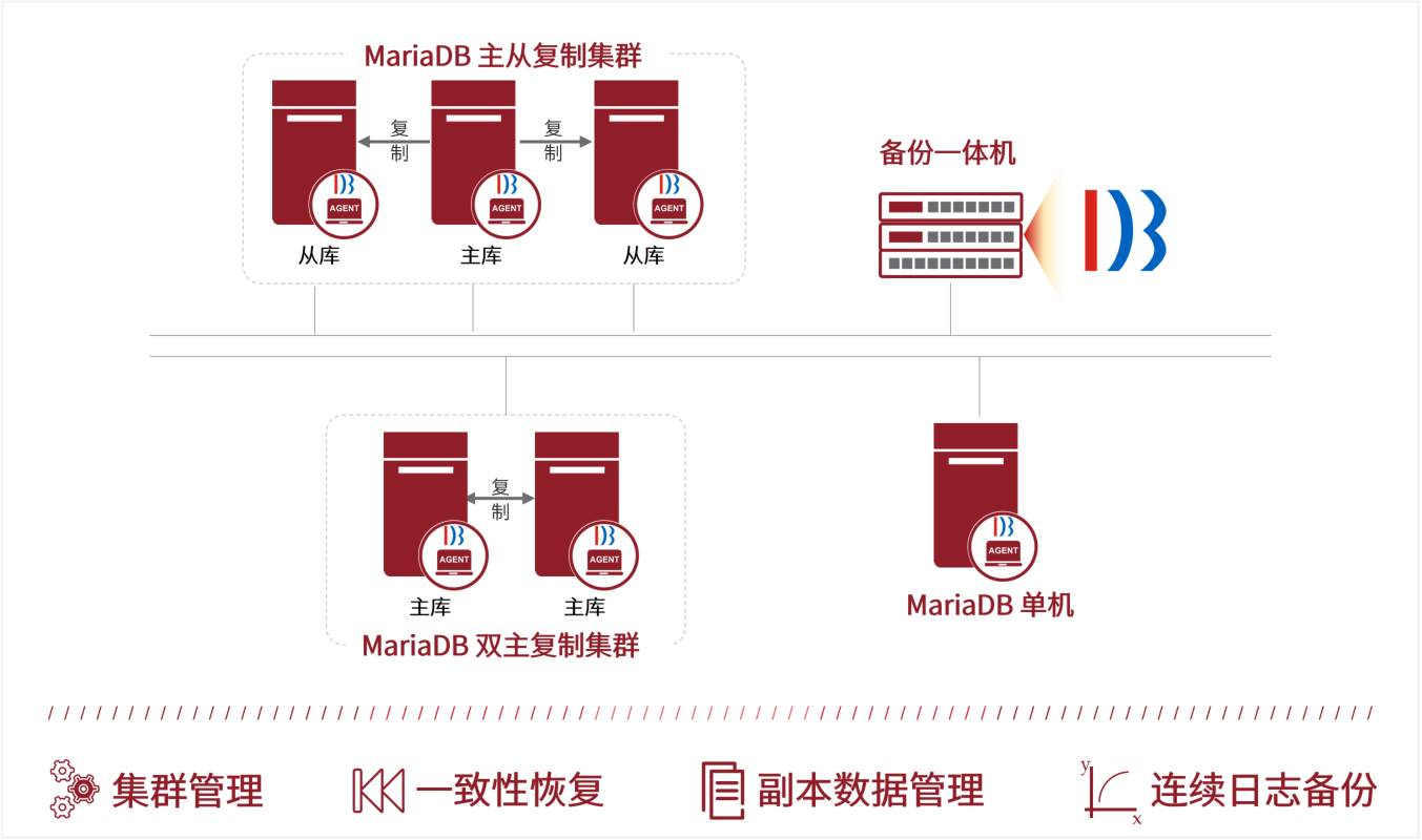 DBackup 在支持單機(jī) MariaDB 的基礎(chǔ)上,再支持 MariaDB 主從復(fù)制、雙主復(fù)制集群的備份恢復(fù),豐富了數(shù)據(jù)保護(hù)的整體解決方案。MariaDB 雖與 MySQL 同源,但全局事務(wù)標(biāo)識(shí)符(GTID)卻差異巨大,為了能保障數(shù)據(jù)庫的一致性恢復(fù),鼎甲研發(fā)團(tuán)隊(duì)進(jìn)行了層層技術(shù)攻關(guān),最終實(shí)現(xiàn)了 MariaDB 指定 GTID 的物理恢復(fù)!