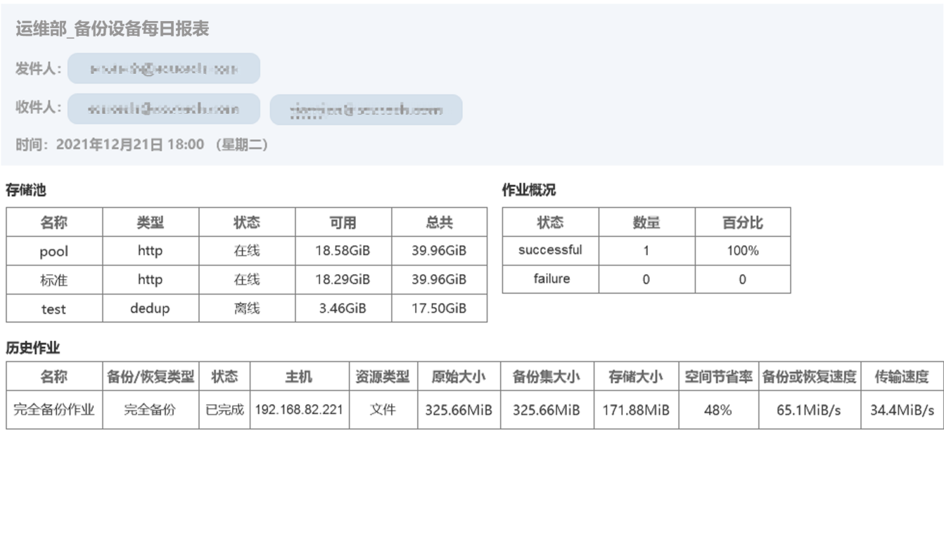 自動(dòng)發(fā)送運(yùn)維郵件是系統(tǒng)每天自動(dòng)生成一份關(guān)于作業(yè)概覽、存儲(chǔ)池狀況、歷史作業(yè)等數(shù)據(jù)的運(yùn)維報(bào)表,每天定時(shí)自動(dòng)發(fā)送到單位各部門指定郵箱,向各部門反饋即時(shí)運(yùn)維情況,有利于運(yùn)維人員全面掌握備份作業(yè)、資源運(yùn)維狀況等,確保備份恢復(fù)運(yùn)維工作有條不紊進(jìn)行。