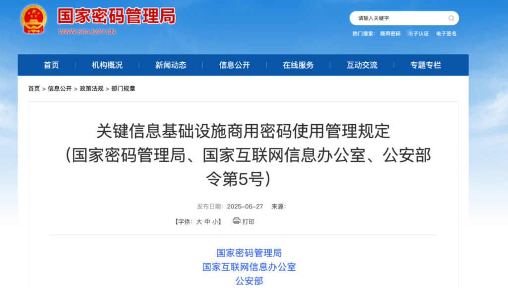 2025 年 6 月 27 日,國家密碼管理局、國家網信辦、公安部聯合發布《關鍵信息基礎設施商用密碼使用管理規定》,自 2025 年 8 月 1 日起正式施行。這是關鍵信息基礎設施(關基)網絡安全領域的重大變革,意味著所有關基單位必須將商用密碼使用納入從 “規劃-建設-運行-評估” 的全生命周期管理。