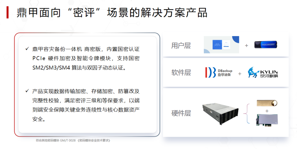 ● 災備系統獨立密評:圍繞災備系統開展商密應用安全性評估,全面覆蓋物理環境、網絡通信、計算設備、數據保護、管理制度、人員職責與應急響應等關鍵環節。鼎甲商密產品憑借權威認證與豐富經驗,除技術達標外,還提供全套文檔資料與測評支持,幫助客戶高效、規范地完成獨立密評,確保系統合規驗收無憂。