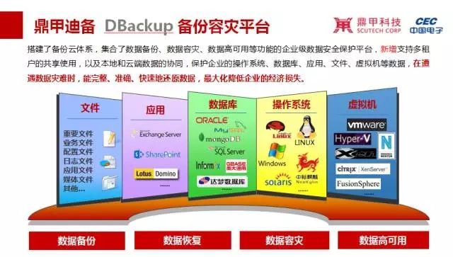 鼎甲迪備( DBackup )搭建了備份云體系,集合了數(shù)據(jù)備份、數(shù)據(jù)容災(zāi)、數(shù)據(jù)高可用等功能的企業(yè)級數(shù)據(jù)安全保護(hù)平臺,支持多租戶的共享使用,以及本地和云端數(shù)據(jù)的協(xié)同,保護(hù)企業(yè)的操作系統(tǒng)、數(shù)據(jù)庫、應(yīng)用、文件、虛擬機(jī)等數(shù)據(jù),在遭遇數(shù)據(jù)災(zāi)難時,能完整、準(zhǔn)確、快速地還原數(shù)據(jù),最大化降低企業(yè)的經(jīng)濟(jì)損失。
