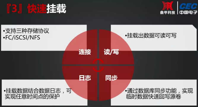 數據/數據庫的閃速恢復。首次全量拷貝,后續通過增量合成全備,大幅度縮短備份窗口;通過即時掛載恢復技術,可在5-30分鐘內快速實現數據庫的掛載恢復;結合數據庫的連續日志,可以在虛擬全備的基礎上進一步降低RPO。