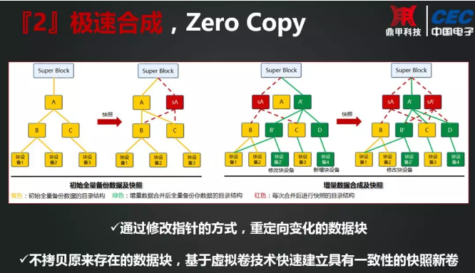 虛擬合并。采用數據索引重定向技術實現了全量數據和增量數據的虛擬合并,解決了傳統數據合成中采用的數據物理復制技術,產生大量數據塊的磁盤移動,引起存儲空間 I/O 負載增加的問題。