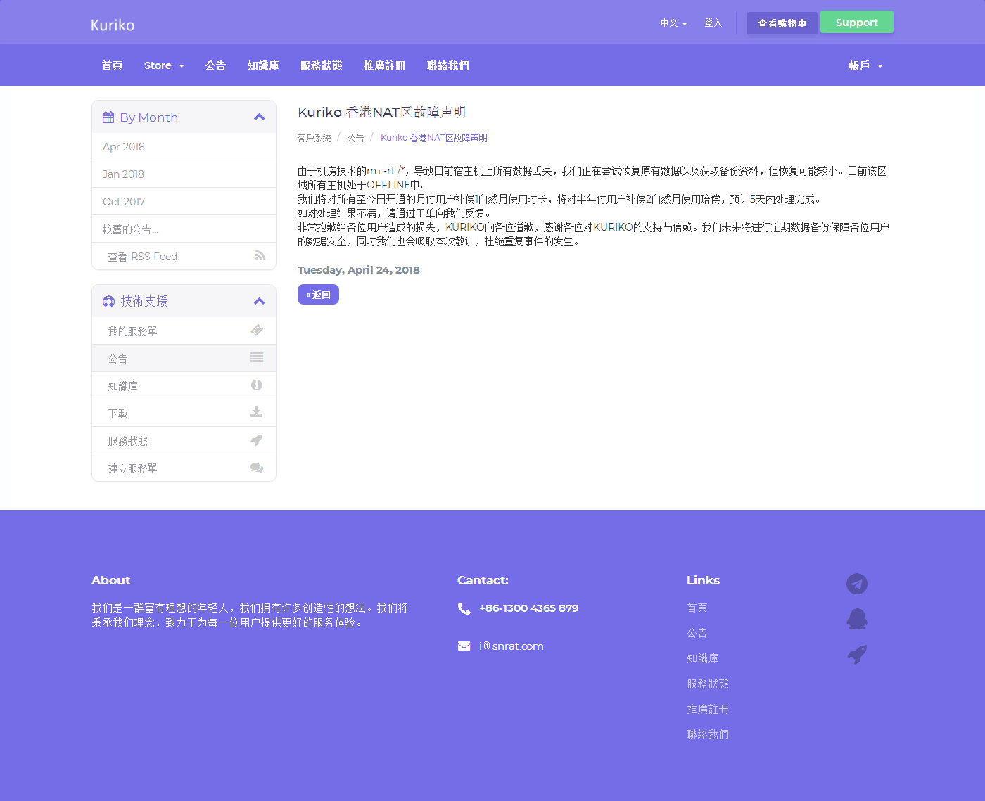 由于機房技術的rm -rf /*,導致目前宿主機上所有數據丟失,Kuriko正在嘗試恢復原有數據以及獲取備份資料,但恢復可能較小。目前該區域所有主機處于Offline中。