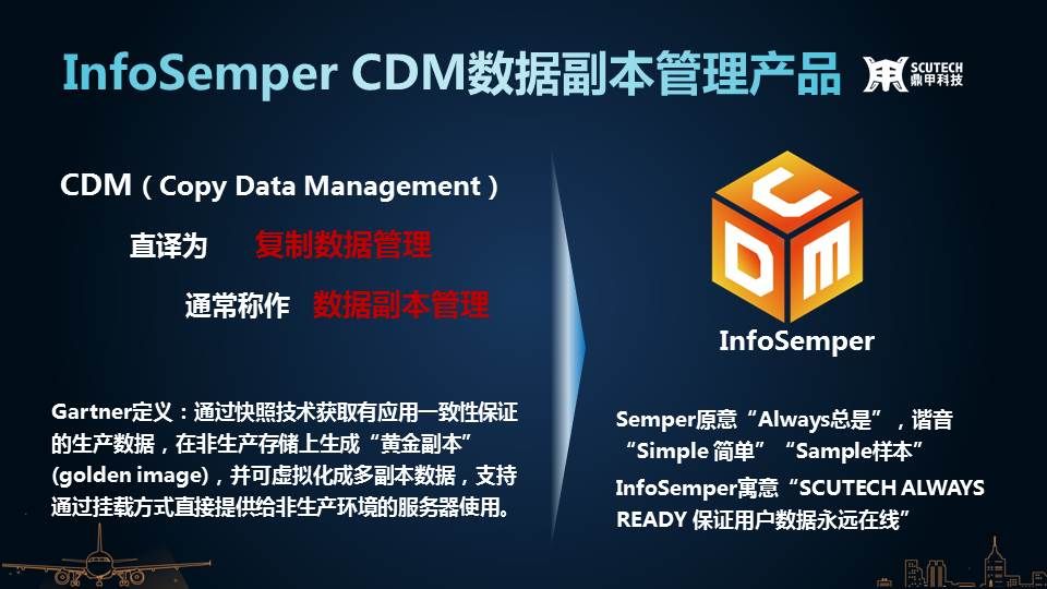 鼎甲發布了國內首款CDM一體機InfoSemper CDM,幫助企業提升數據副本管理的效能。歷經三年的技術積累,已在江蘇郵政、南京政務云成功落地實施,也已通過客戶驗收,備受好評。InfoSemper CDM是利用客戶端應用資源的專用接口捕獲生產環境中的文件、數據庫、虛擬機等數據,基于快照數據建立多副本管理體系,通過副本掛載實現數據的即時恢復,既可以支持生產環境的應急使用,又可以支持非生產環境的開發、測試、數據分析等使用。